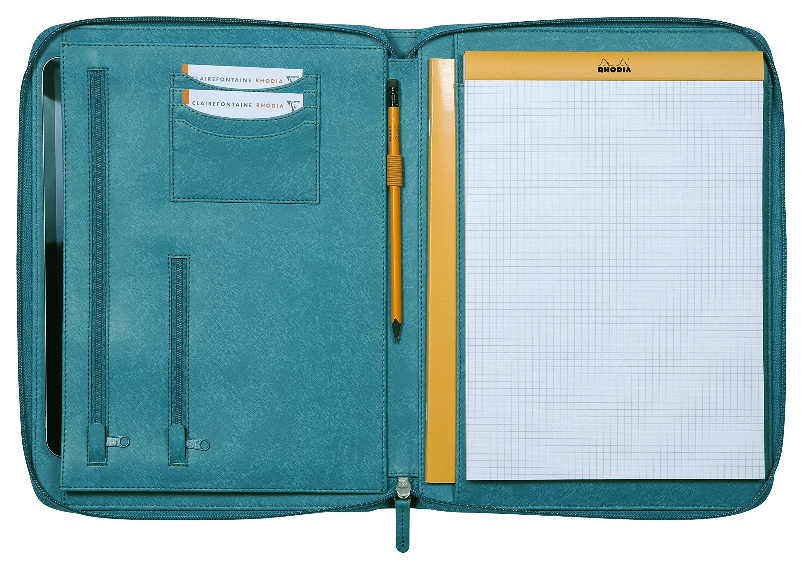 Rhodia 168119C - Rhodiarama Large Leatherette Zipped Portfolio for Notepad or Tablet 25.5x34cm gusseted Pocket for Tablet 2 Zipped Pockets Card Holder Pencil Holder - Peacock